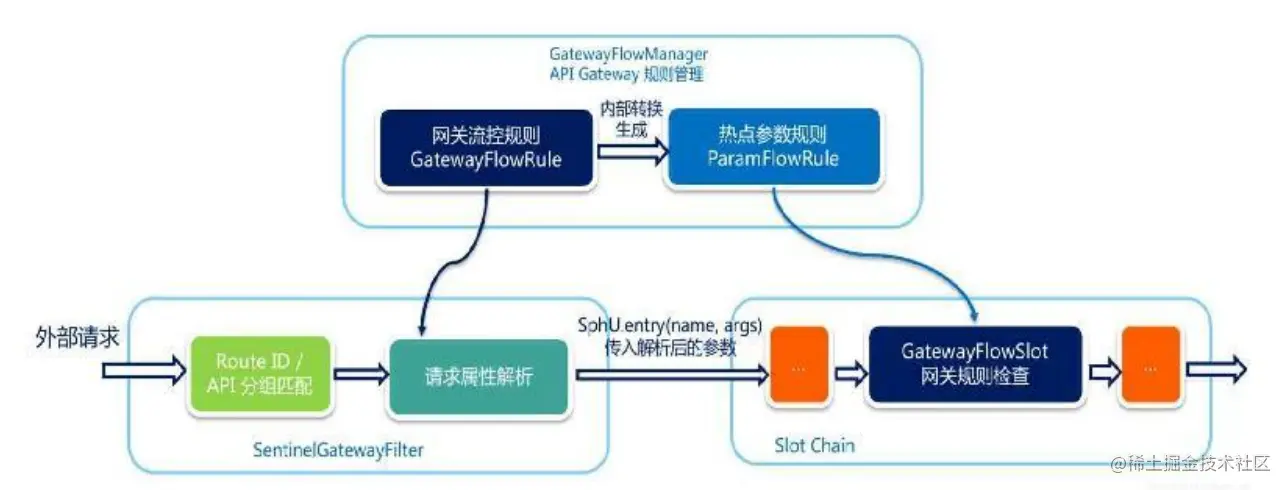 - 在外部请求进入API网关时,会先经过SentinelGatewayFilter,在该过滤器中依次进行Route ID/API分组匹配、请求属性解析和参数组装。