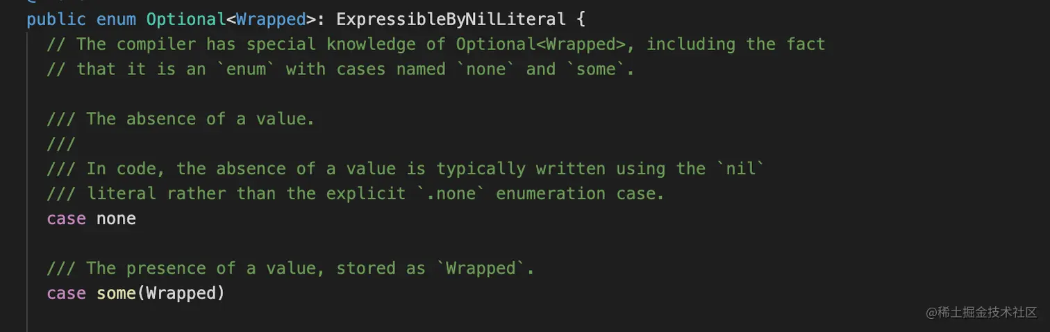 Optional本质上是一个枚举,当前枚举接受一个泛型参数,而当前some关联的值是Wrapped,也就是说下面两种写法是一样的