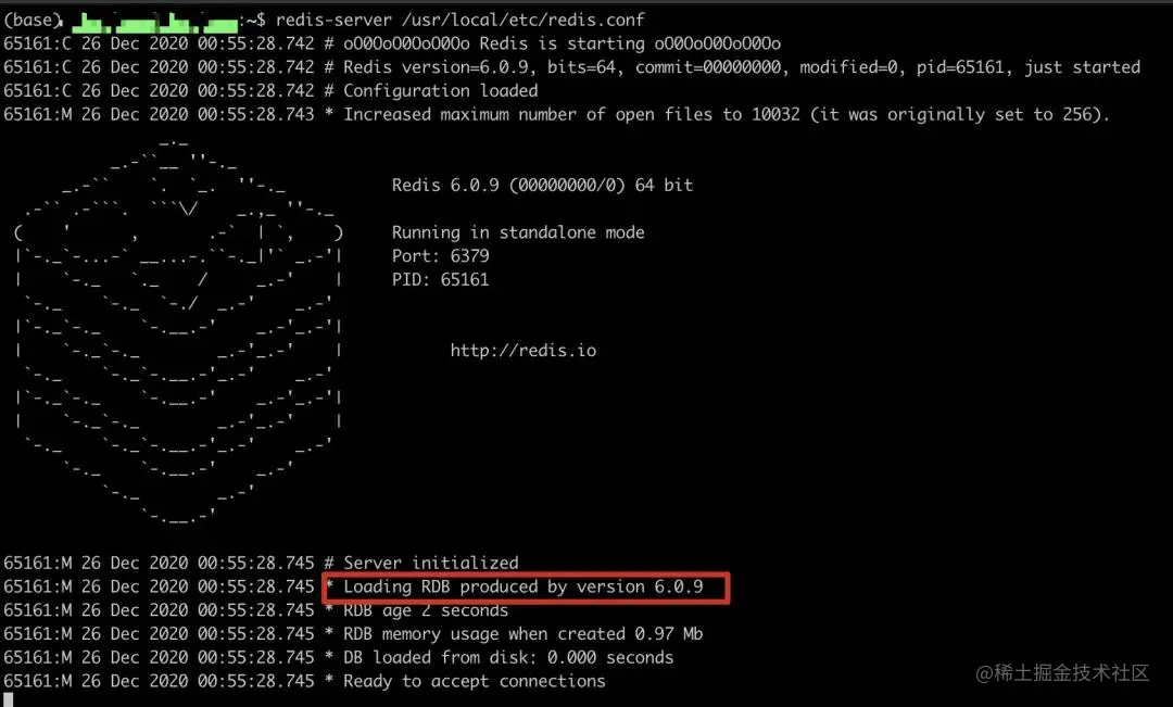 启动 Redis 服务,我们可以从启动日志中看到,默认是会先读取 RDB 文件进行恢复的