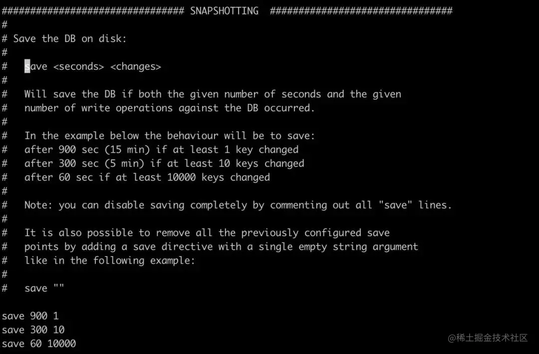 我们可以在 redis.conf 进行 RDB 的相关配置,配置生成快照的策略,以及日志文件的路径和名称。还有定时备份规则,如下图所示,里面的注释写的很清楚,简单说就是在多少时间以内多少个 key 变化了就会触发快照。如save 300 10 表示在 5 分钟内如果有 10 个 key 发生了变化就会触发生产快照,其他的同理。