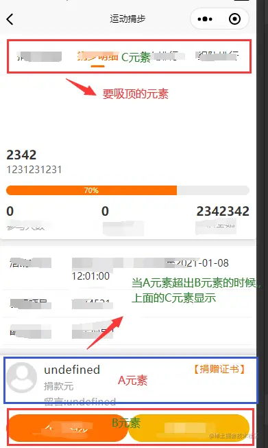 - 其中要明白的是滚动的距离就是A元素上升的距离,则当A元素初始距离减去上升距离小于B元素的初始距离时,则表示A元素已经超出B元素,此时C元素显示