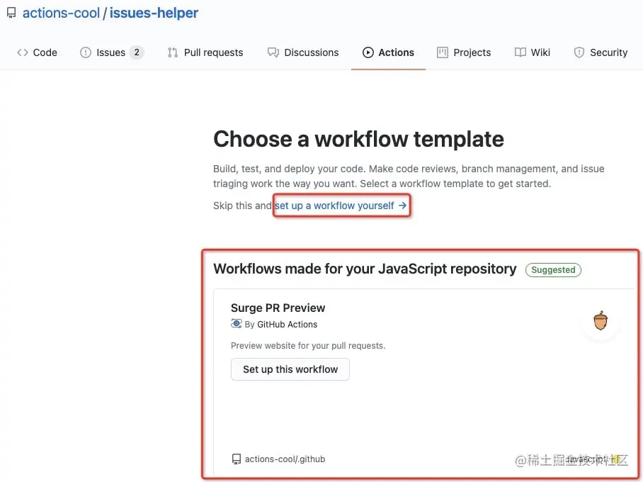 你可以点击 set up a workflow yourself 新增一个自定义 action,也可以根据模板来套用新增一个 action。模板使用。