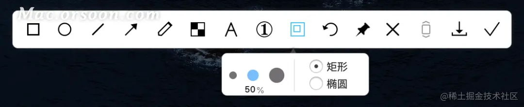 单击确定截图区域,截图下方会弹出 iShot 截图的工具栏,这里的工具有添加箭头、马赛克、高亮显示(以突出截图的重点内容)、贴图、滚动截图等。