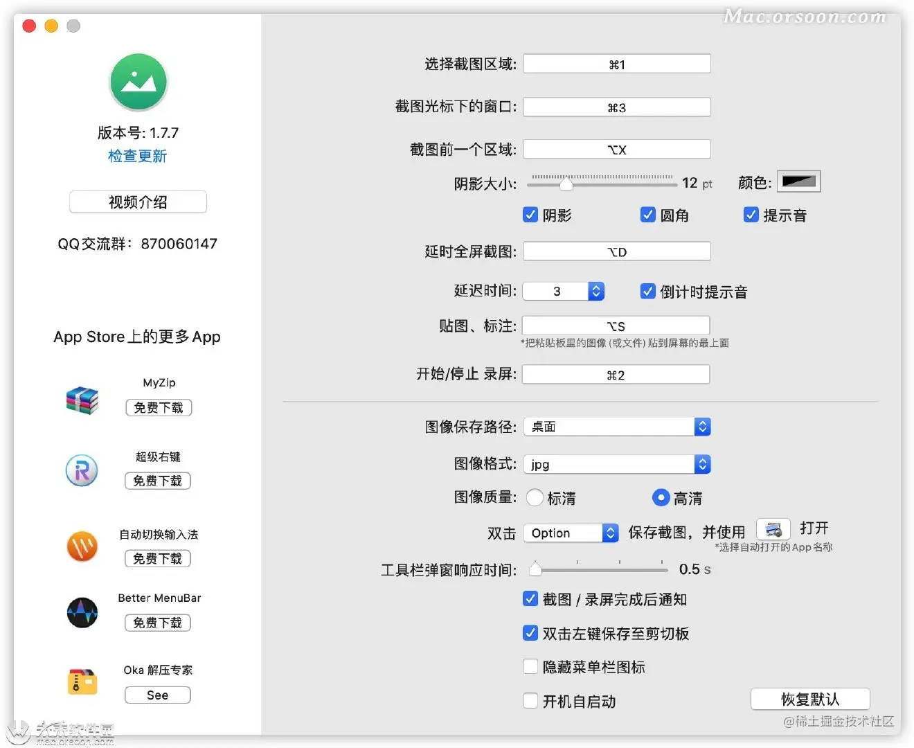 打开 iShot 的「偏好设置」,可以选择是否启用阴影以及设置阴影的大小。