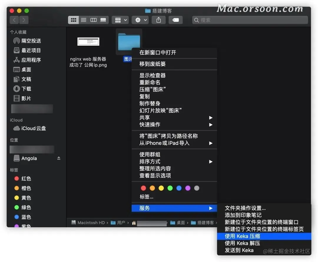 附上使用 Keka 压缩文件的方法:右击文件,选择「服务 >> 使用 Keka 压缩」