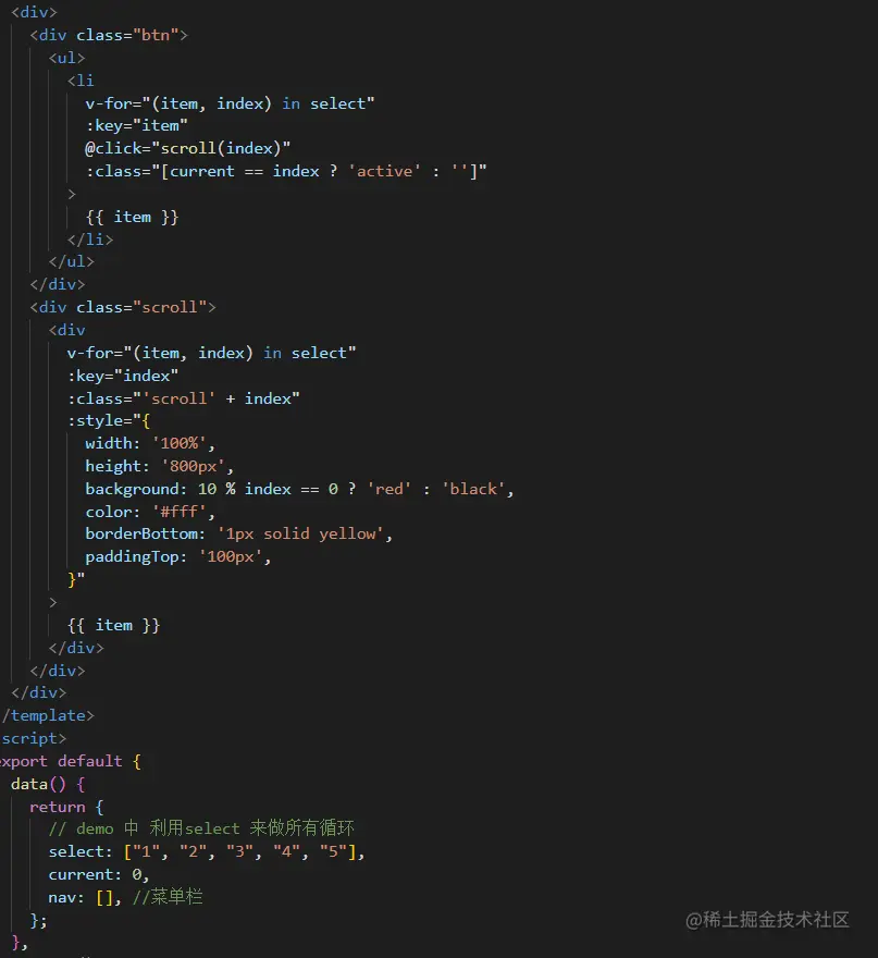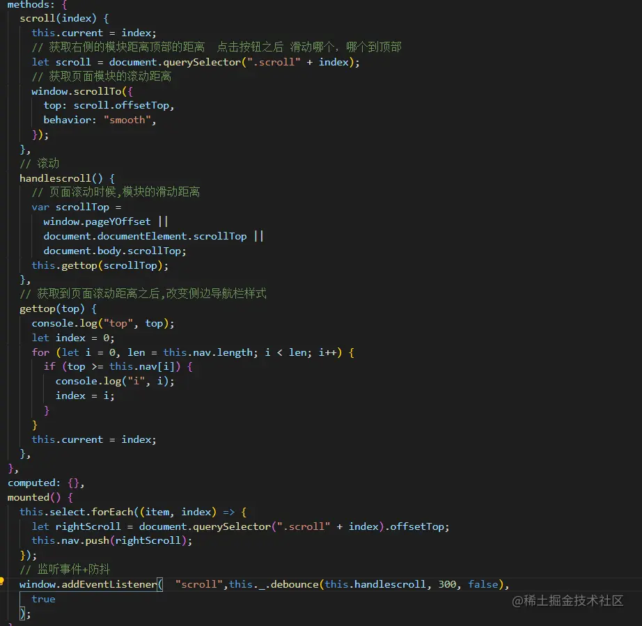 页面滚动 侧边导航栏改变,点击导航栏内容,相应页面内容到达顶部 枫叶秋 2020-12-31 516 阅读1分钟 mounted():中 nav获取到页面模块距离顶部的高度, 在利用gettop方法去页面滚动时候到达的滚动高度做比较,改变导航栏样式 注意: 最后出来的结果 侧边栏也可点击按钮 实现页面模块到达顶部