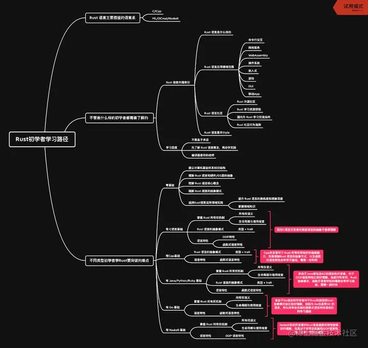 基于张老师这份思维导图,我们将其中的一些分支内容做了详细拆解,或许可以为Rust语言的初学者们解惑,稍微降低学习曲线的陡峭度。