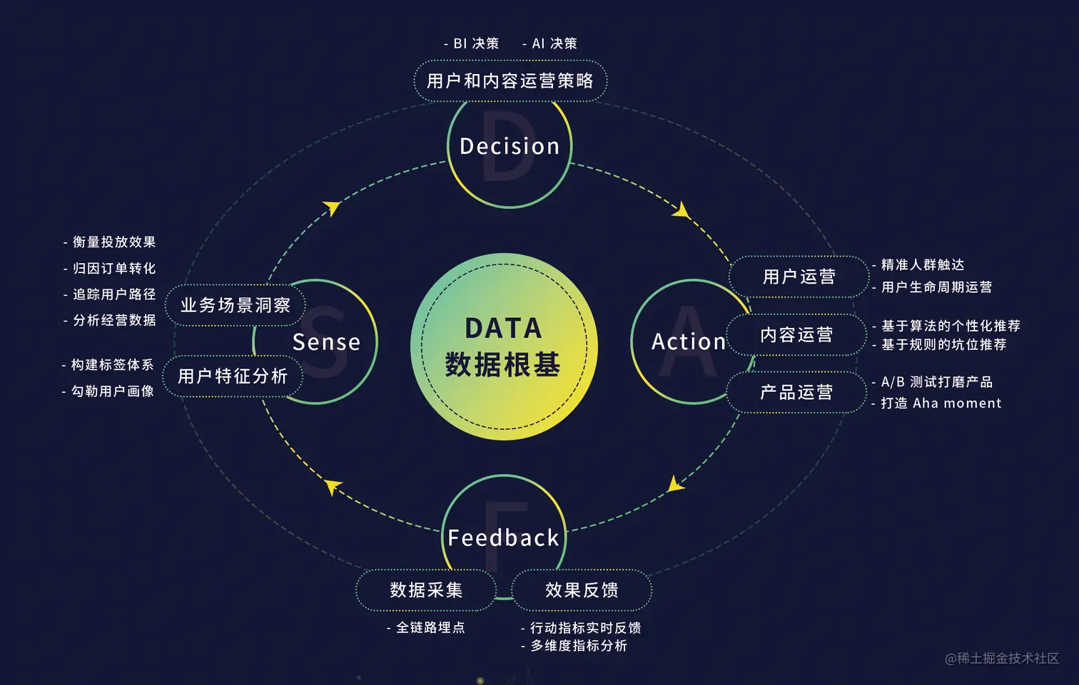 首次提出集感知(Sense)、决策(Decision)、行动(Action)、反馈(Feedback)为一体的 SDAF 模型,我的一切产品和服务均围绕 SDAF 模型,帮助客户构建基于数据流的企业数字化闭环。