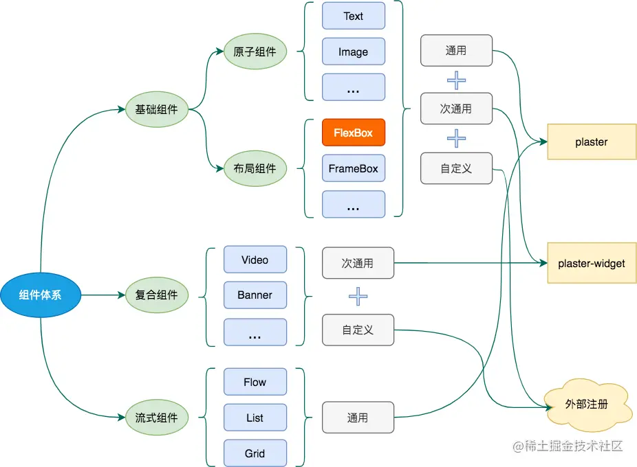 值得注意的是,目前除了流式组件内置在Plaster框架内,基础组件和复合组件的包方式的按照通用性分为三个类别,最通用的内置在Plaster内,次通用的放置在plaster-widget内,不具有通用性的组件由开发者自己在外部实现并注册到Plaster内。其组件分类如下: