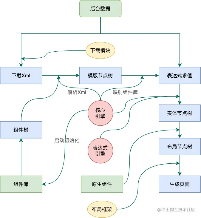 主要流程有这么几个核心模块组成:核心引擎、下载模块、表达式引擎、布局框架,整个流程主要由这些模块串联起来。其过程如下:
