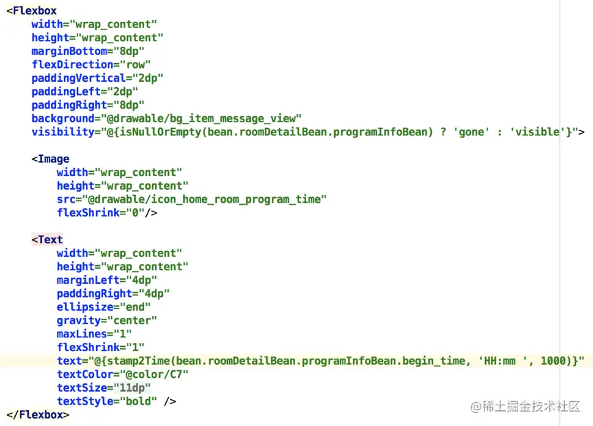 Plaster的DSL分为两个部分,一是布局DSL,二是表达式DSL。下图为目前首页布局描述的部分截图样例,其中Flexbox、Image、Text都属于布局DSL领域,而属性中带@符号的运算式属于表达式DSL。