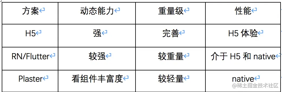 值得注意的是,对Plaster来说,动态布局的轻量级不代表动态能力弱,动态能力的大小取决于注册在客户端的组件丰富程度。2、几种动态化技术对比