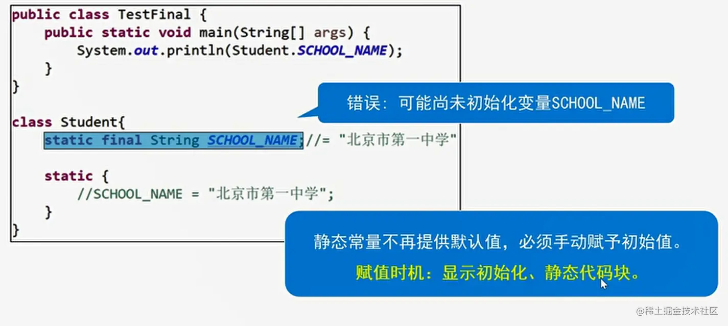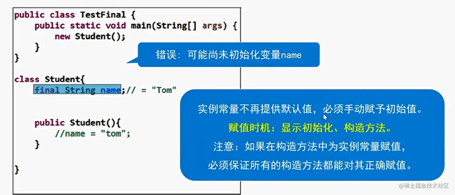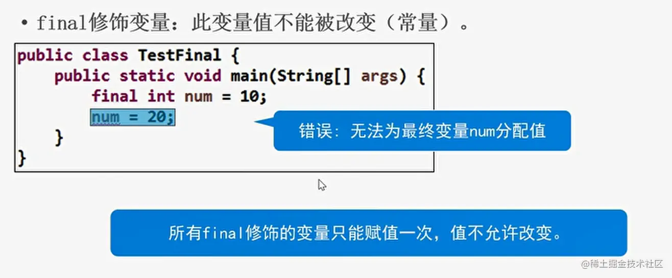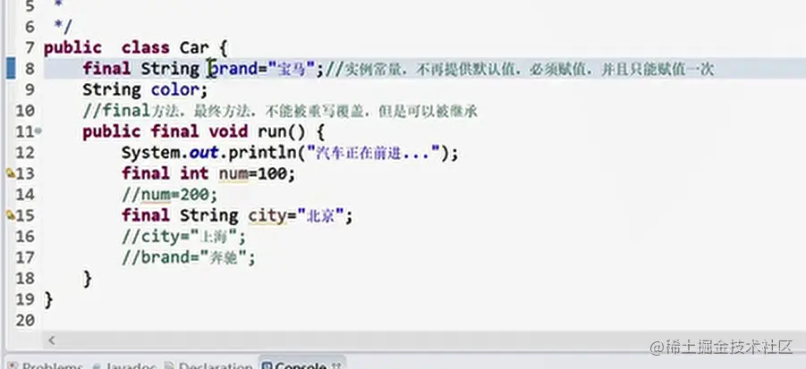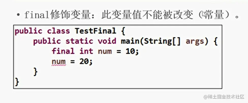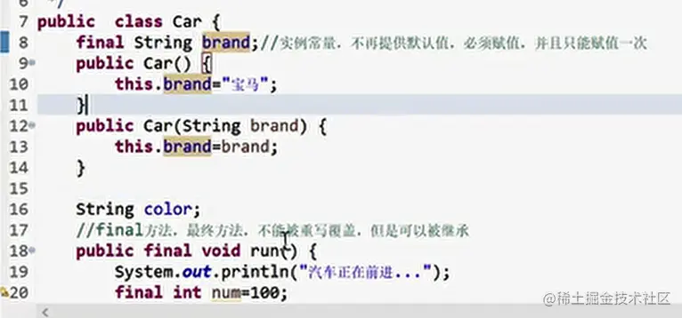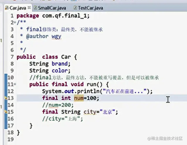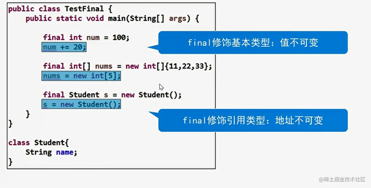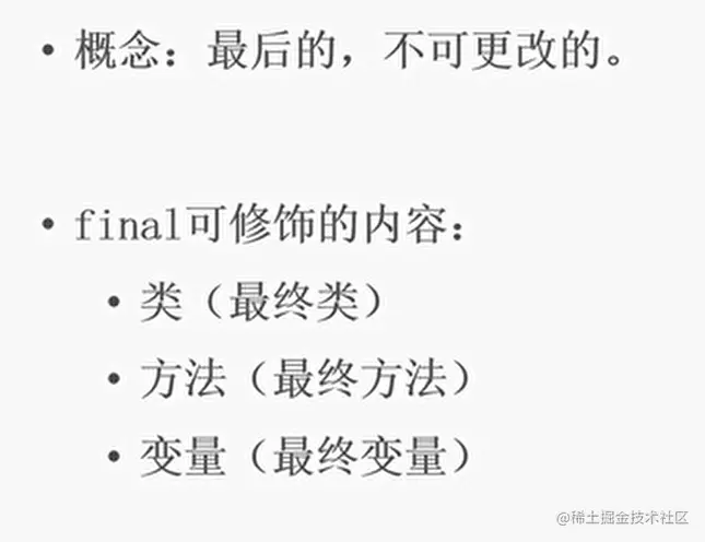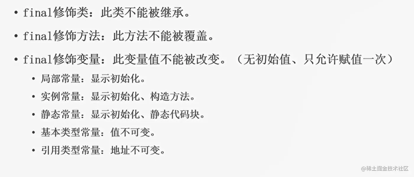 178-183 最终final ifubing 2020-12-31 65 阅读1分钟 什么是最终 final类 不能继承的类 final的类 最终类 final修饰方法 正常继承 父类最终方法 子类不能重写这个方法了 但是子类可以使用 final变量 被final修饰的变量 相当于是一个 常量 修饰后无法修改 final修饰局部变量 final实例常量 定义时赋值 构造方法中赋值 在带参的构造方法中赋值 final 静态常量 可在定义时赋值 也可在静态框中赋值 对象常量 修饰基本类型,值不可变 修饰引用类型,引用不可变 引用对象的值可以修改 final小结