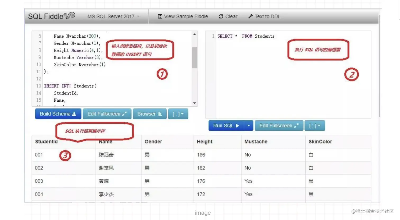 区域 1 的编辑器用来创建数据库 schema ,比如建表,新建数据; 区域 2 则用来编辑和执行 SQL; 区域 3 用来展示 区域 2 中的 SQL 执行结果 使用这款工具,无需你手工安装数据库便可以完成本指南所有的 SQL. 完美!我们成功的完成了第一步。