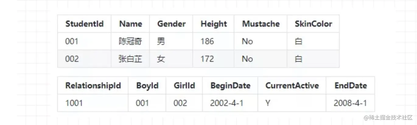StudentId: 用来标注学生的学号,一个学生只有一个学号; Name:学生姓名; Gender:学生性别; Height:学生身高,cm 为单位 Mustache:有无胡子; SkinColor:肤色 第二张表是 Relationships(恋爱关系秘本),共有 6 栏,分别解释下: