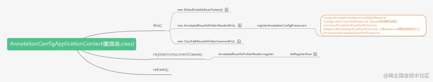 new AnnotatedBeanDefinitionReader(this)代码的追踪发现真正做事情的AnnotationConfigUtils.registerAnnotationConfigProcessors(this.registry);由于该方法代码较多,这里只把最核心的代码贴出来。