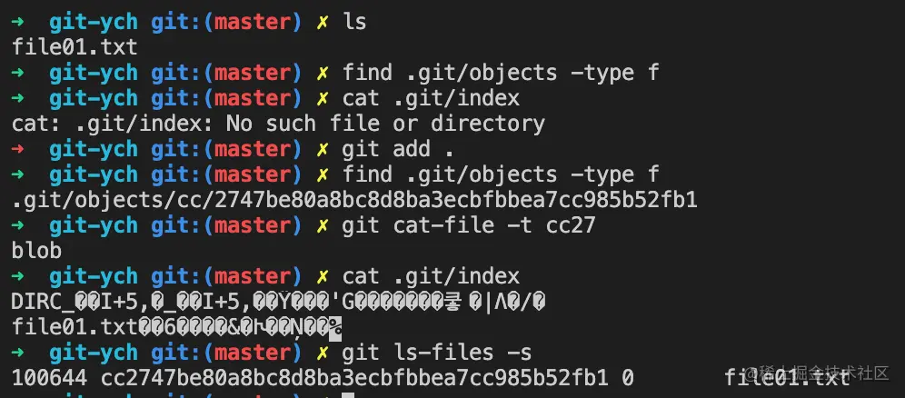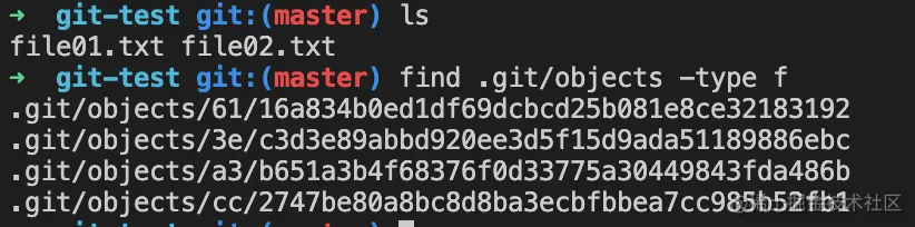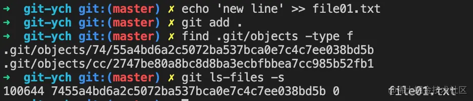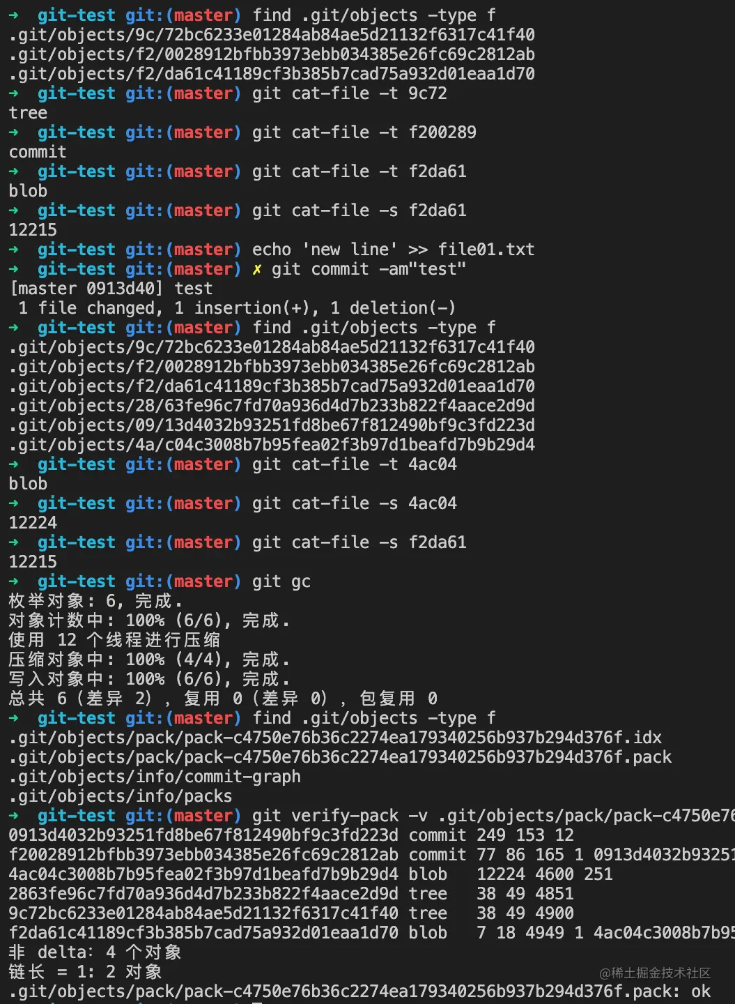 在打包前,objects/pack和objects/info文件夹为空,文件以松散对象的形式存储在objects目录下。打包后,文件全部打包到 objects/pack 中。pack后缀文件存储对象文件,idx后缀文件是索引文件,用于允许它们被随机访问。objects/info 文件夹记录对象存储的附加信息,info/pack文件中记录打包文件的文件名(上图中为:P pack-c4750e76b36c227...idx)。