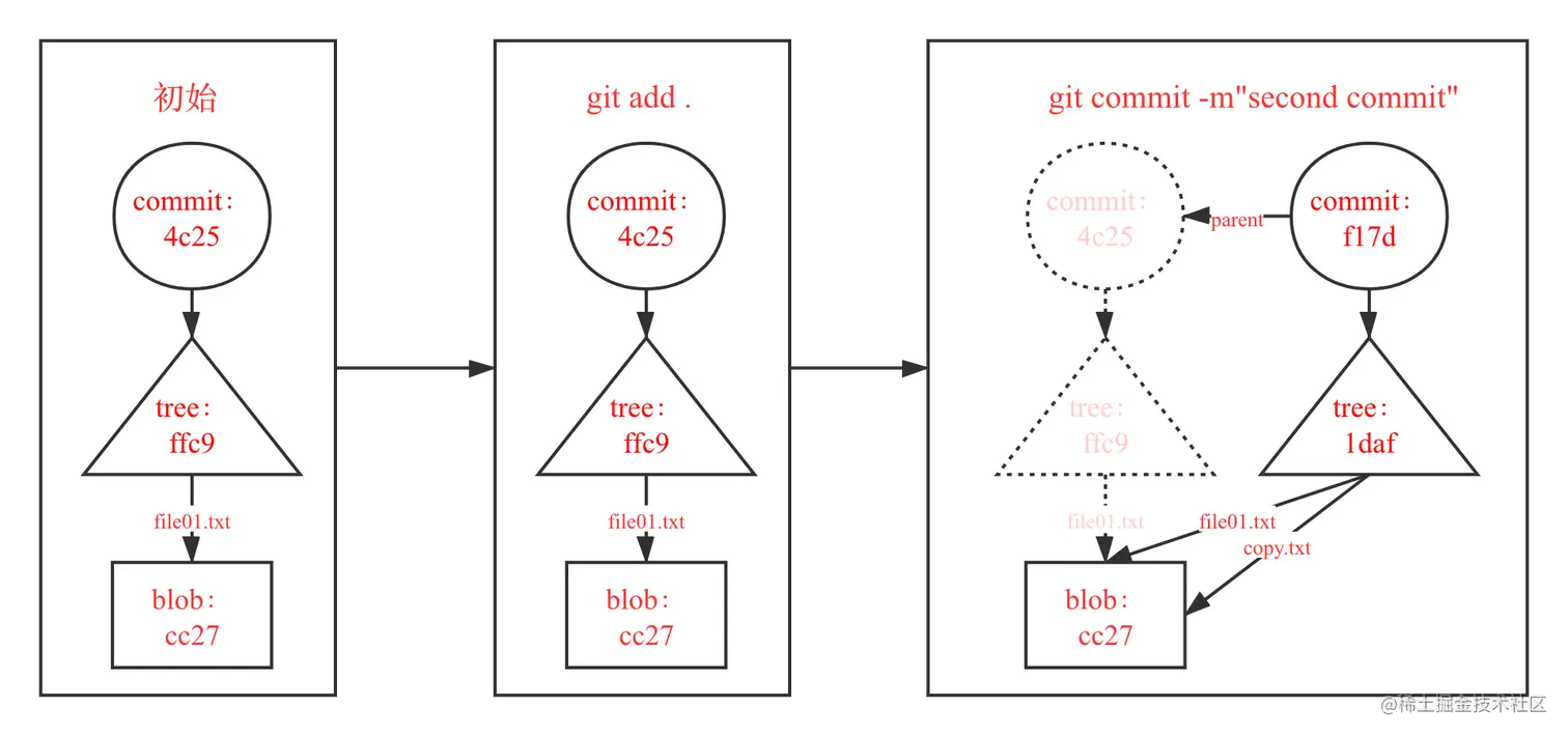 上图展示的例子中,提交为master分支的首次提交,对于非首次提交,commit对象还会记录parent信息,即本次commit所对应的上一次提交。 三者关系对应图示如下: