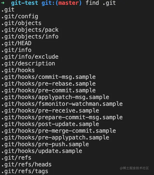 初始化一个git仓库,此时文件夹中只有一个隐藏文件夹 .git , .git 文件夹为git的版本库,存放git实现版本控制所需要的全部信息。使用 find .git 命令查看 .git 中存储的内容如下: