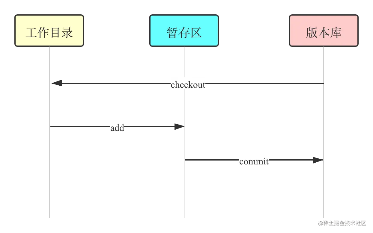 在工作目录与仓库之间还有一个暂存区。当我们在工作目录中对文件进行增删改等操作时,这些被修改的内容在 git add 命令之后,就会被添加到暂存区中。 git commit 之后,将暂存区中的内容添加到版本库中(进入对象库中)。