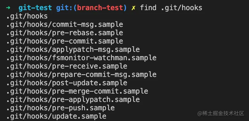 Git 能在特定的动作发生时触发自定义脚本,这些脚本(钩子)都被存储在 hooks子目录中。 如上图,这些示例文件的名字都是以.sample结尾,如果想启用这些钩子,得先移除sample后缀。把一个正确命名(不带扩展名)且可执行的文件放入hooks子目录中,即可激活该钩子脚本。 这样一来,它就能被 Git 调用。