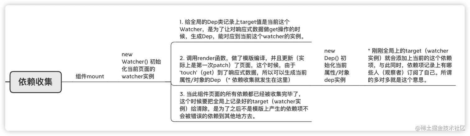 我们注意到上面的那张图所描述的,render => "touch" => data.getter => Collect as Dependency。这句话的意思是,在初始阶段,把需要用到的响应式数据收集成为当前组件的依赖。这就是我们所说的依赖收集。所以到了这一步,你应该知道我们为什么要做依赖收集了把?只有依赖收集了,才能对应到那个观察者,才可以实时调用render函数,更新视图。