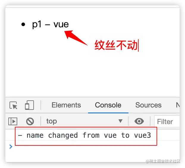 好,那么我们现在回到Vue.js,怎样让具备在数据变化时有对其进行反应的能力?其实质就是核心的defineReactive,落实到js里面就是Object.defineProperty。再者,什么是通知呢?在上一篇完成的代码里面,我们去尝试改变data模型里面的数据:<body> <p>p1 - {{name}}</p> </body> <script> let vm = new Vue({ el: '#app', data() { return { name: 'vue', } } }) setTimeout(() => { vm.name = 'vue3' }, 1000) </script>结果: