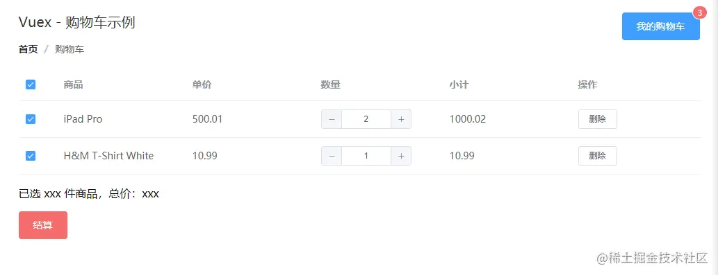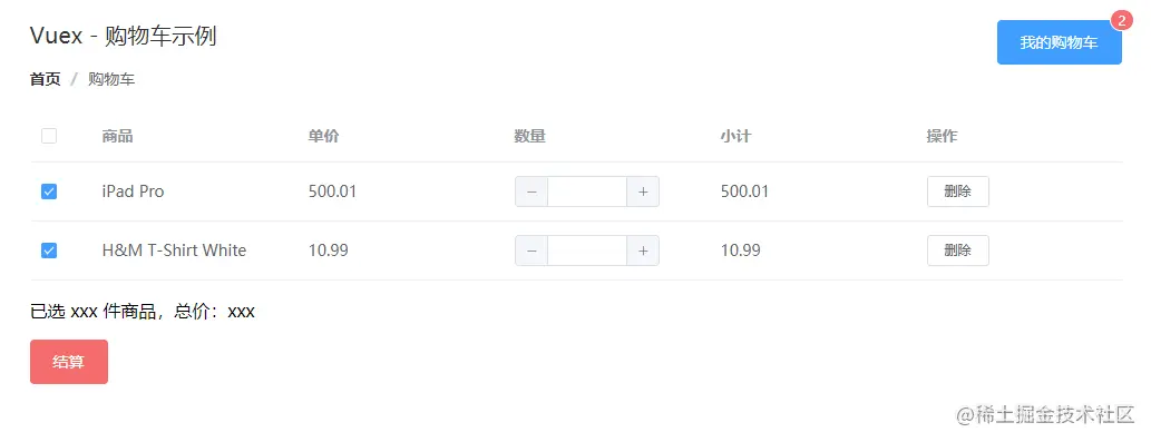 - 展示多选框,商品,单价,数量及【加减按钮车】,小计,【删除】按钮,总量和总价,【结算】按钮