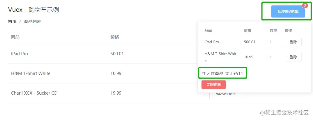 popover,展示购物车里面的商品,价格数量,【删除】按钮,还有总数量和总价格,还有【去购物车】按钮 - 【删除】按钮可以删除整个商品,总价和数量都会改变
