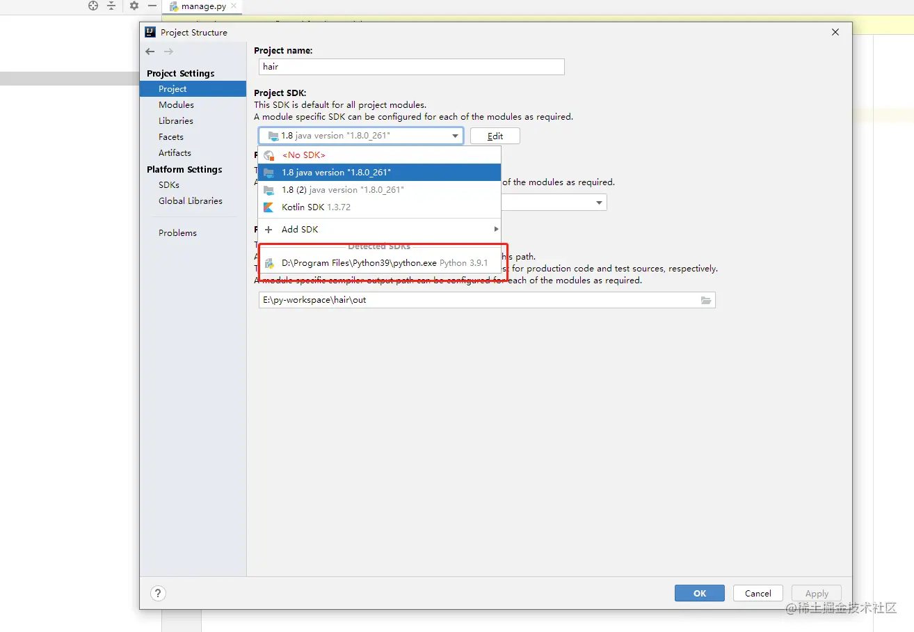 点击右上角的 “Configure Python interpreter”链接,弹出项目配置窗