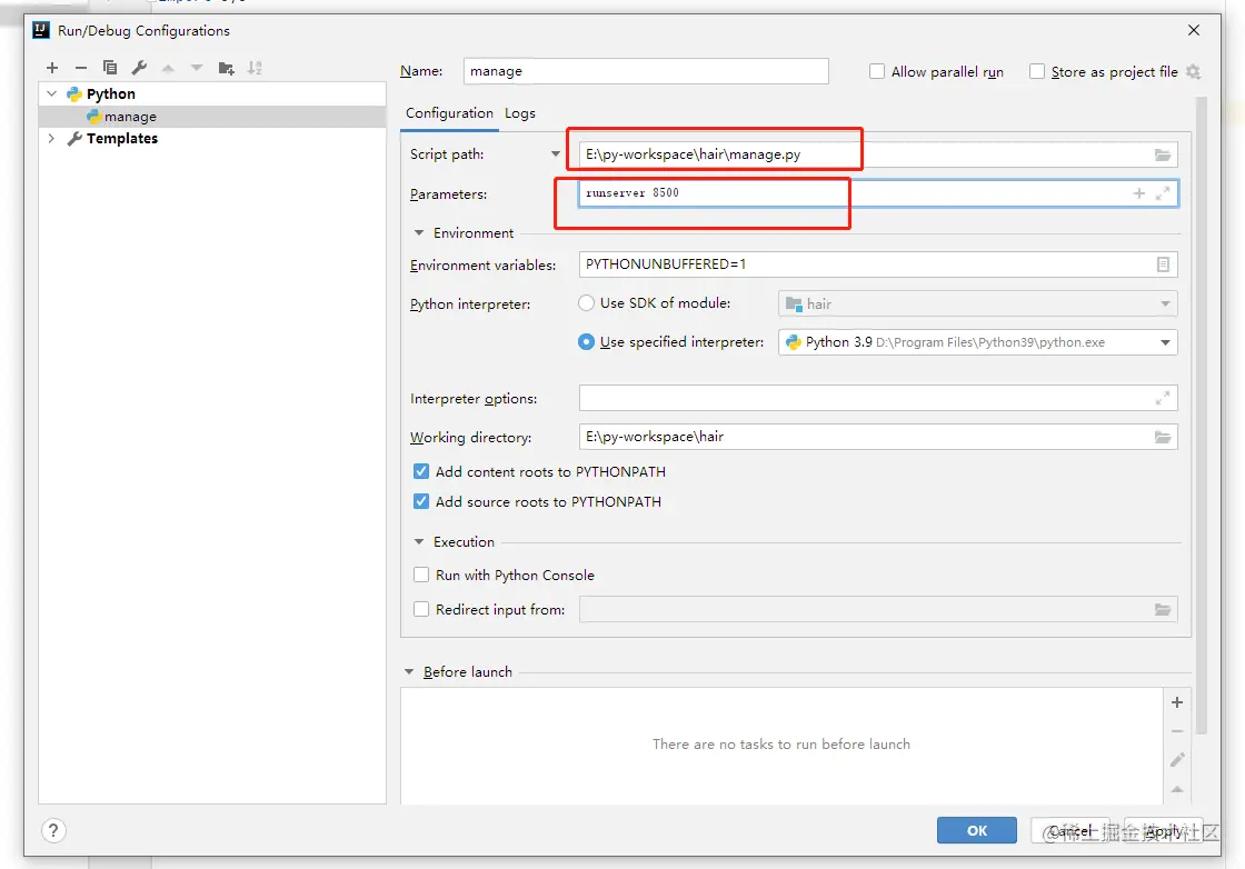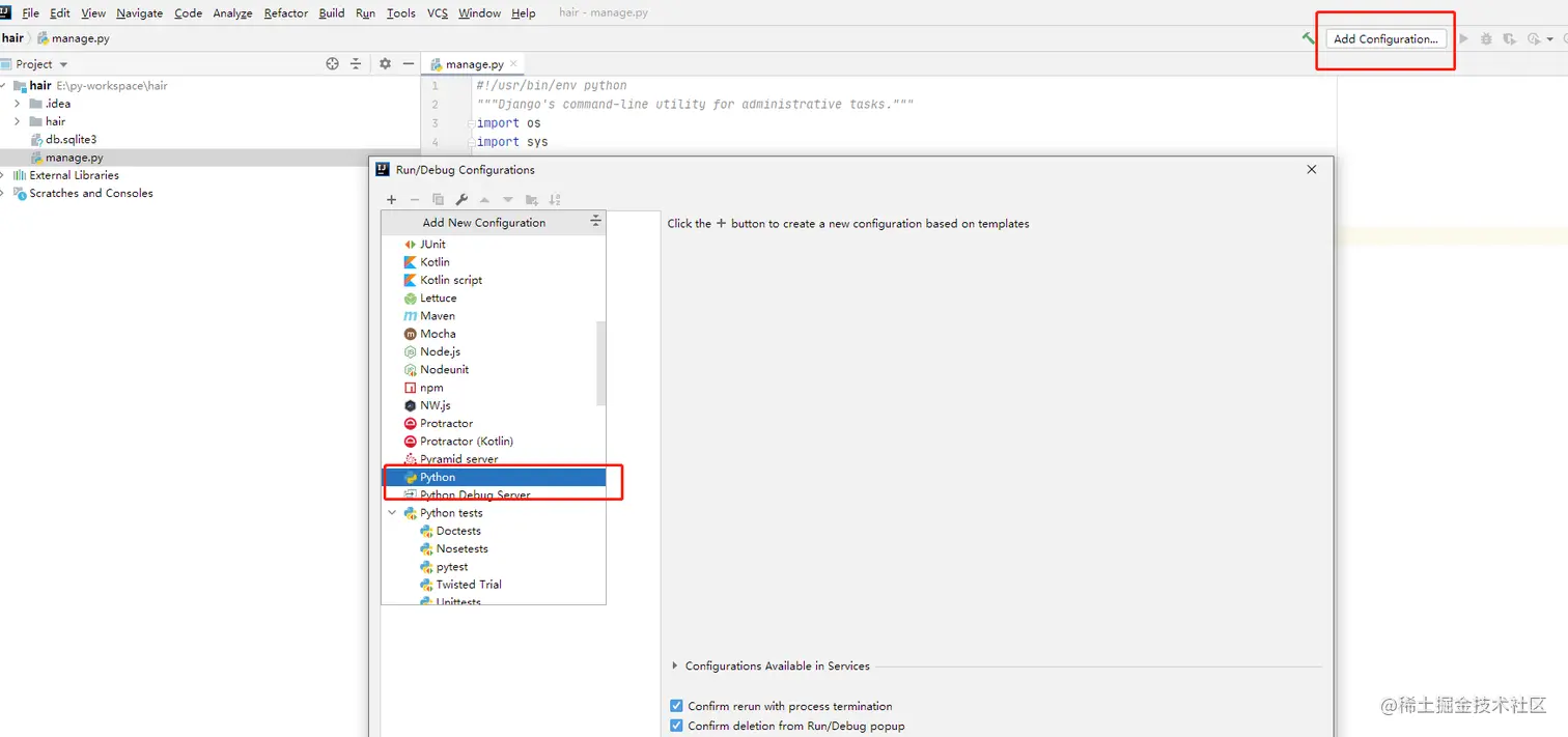 配置两个参数即可,分别是manage.py的绝对路径和服务器运行命令