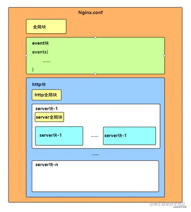 可以嵌套多个server模块,配置代理、缓存、日志定义等和第三方模块的配置。包括: