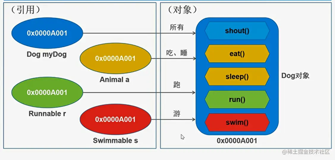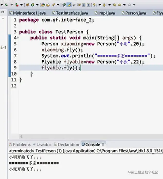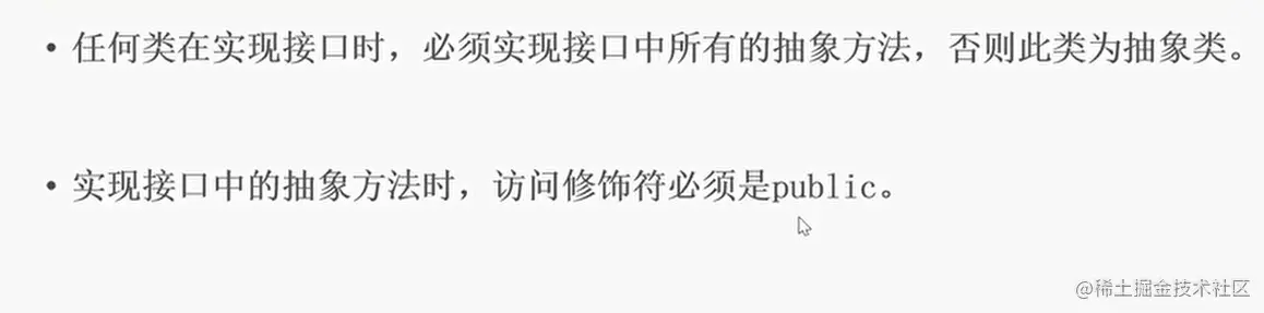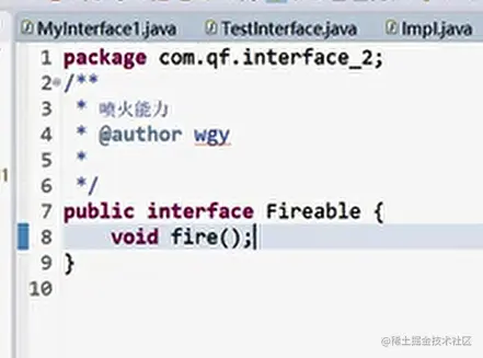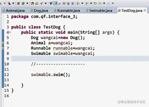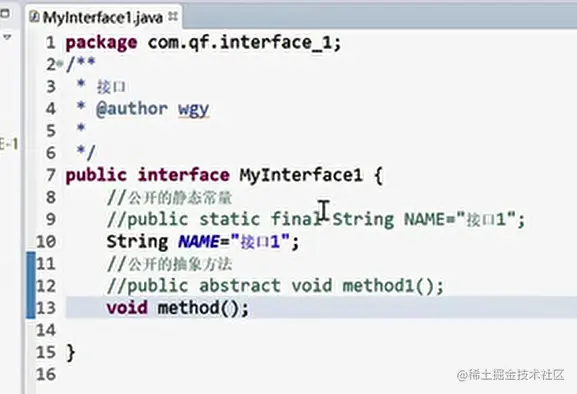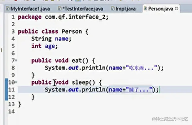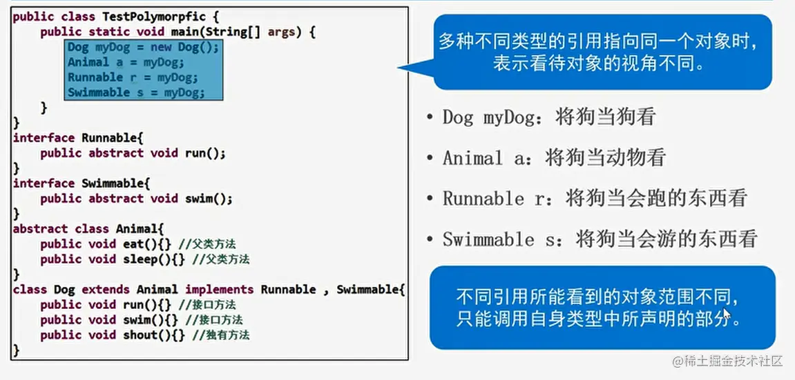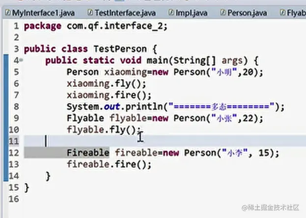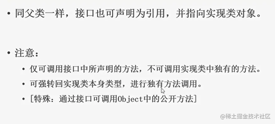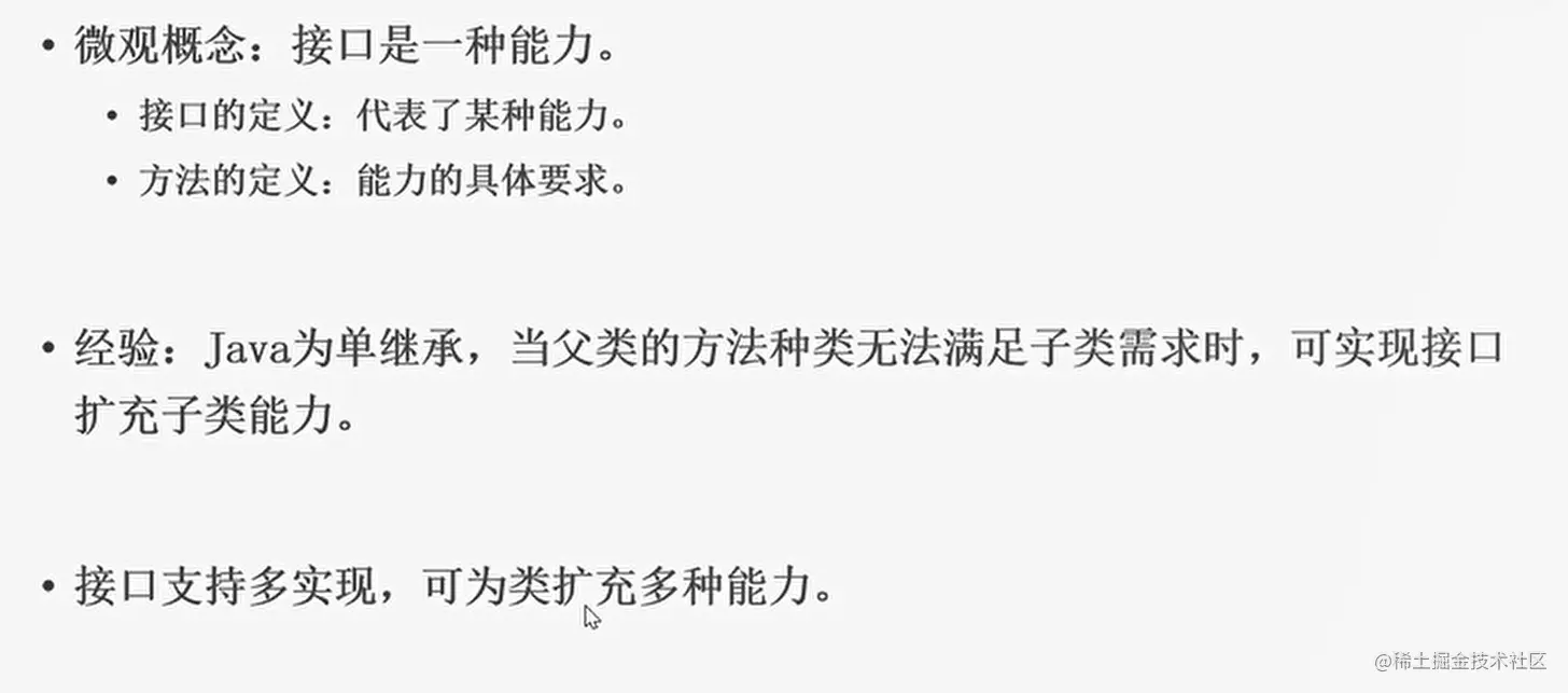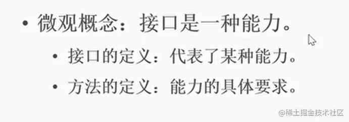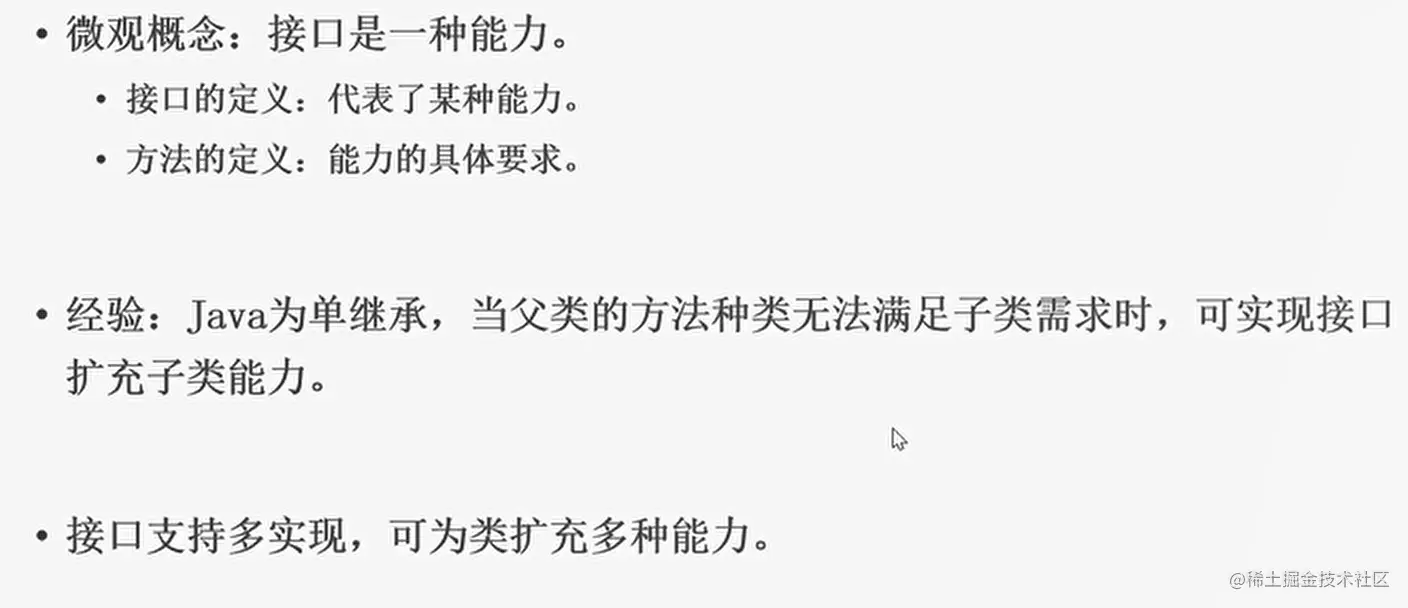 184 -189 接口 ifubing 2021-01-01 85 阅读1分钟 接口的语法 》例,接口的定义 默认公开的静态常量 默认公开的抽象方法 》接口的使用 不能把接口实例化 类与接口的关系 类用于实现接口 父类型变量实例化子类 接口与抽象类的异同 什么是接口 演练 定义一个人类 定义一个接口 让人类实现接口 操作 接口 定义一个喷火的接口 人类实现喷火接口 类实现接口后,需要重写一下方法 使用接口类定义的对象 只能调用接口中的方法 不能调用实例化的类的方法 接口的规范 接口引用 接口的多态 演练 狗继承,狗实现 不同类的对象 可执行方法不同 接口的多态