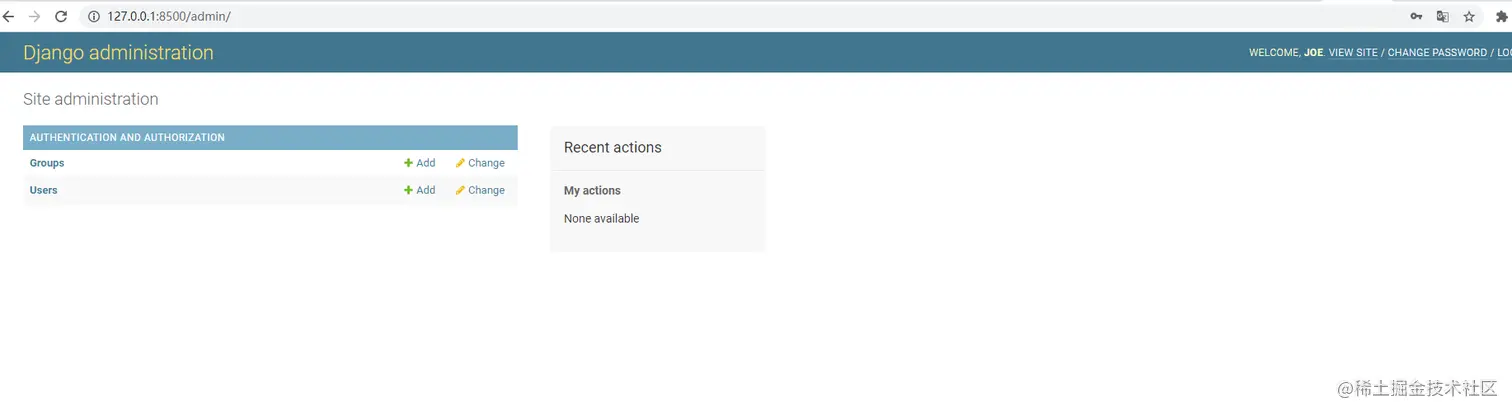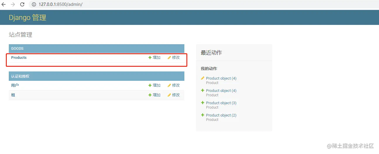 重新启动项目,在浏览器中进入"127.0.0.1:8500/admin/",录入用户名和密码,进入主界面