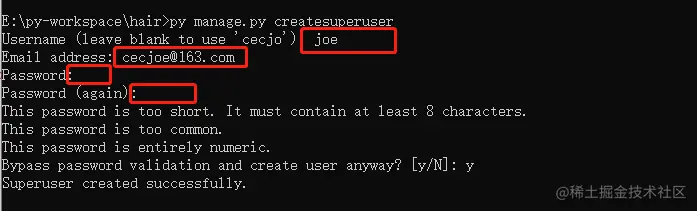 根据命令行提示信息,依次录入用户名、邮箱、密码,如下: