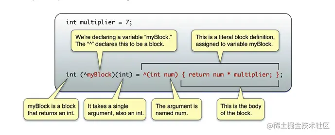 block是由 ^ 返回值类型 参数列表 表达式 几部分组成的,返回值类型和参数列表和c语言函数一致,表达式中含有return语句时,其类型必须与返回值类型相同