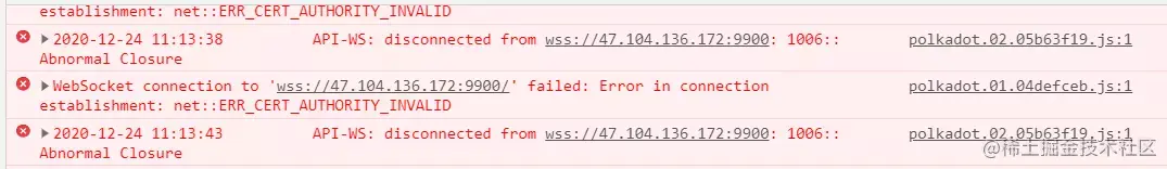 从上面的截图数据,很容易判断出是Web socket over SSL 链接有问题,即wss协议(wss://47.104.136.172:9900)的配置问题。