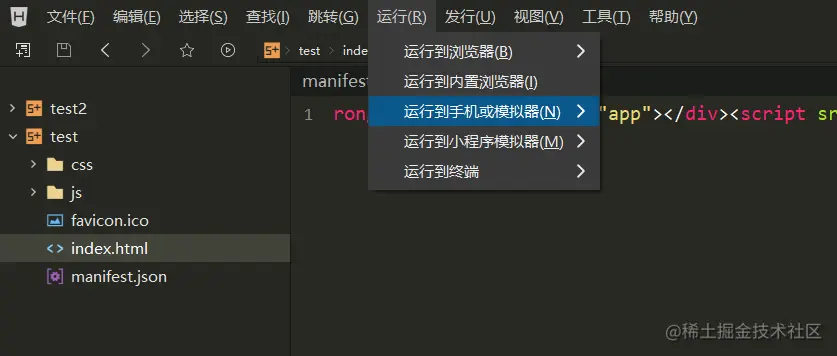 回到Hbuildx,选中index.html,点击运行->运行到手机或模拟器,选中模拟器