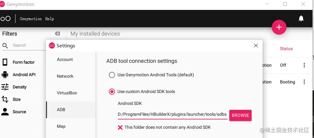 6.配置genymotion模拟器,将abd地址替换成hbildx的adb地址,然后启动