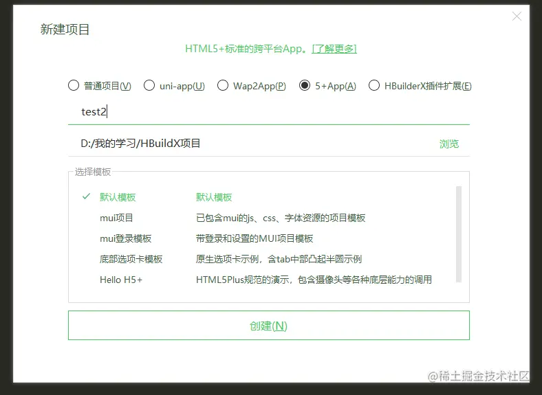 新建项目,选择5+APP,输入项目名,点击创建