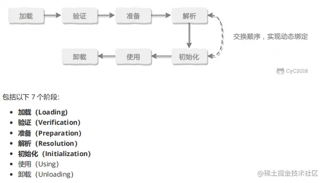 其中解析过程在某些情况下可以在初始化阶段之后再开始,这是为了支持 Java 的动态绑定。