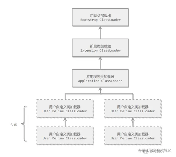 - 所有其它类的加载器,使用 Java 实现,独立于虚拟机,继承自抽象类 java.lang.ClassLoader。 从 Java 开发人员的角度看,类加载器可以划分得更细致一些: