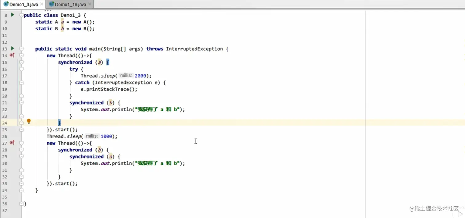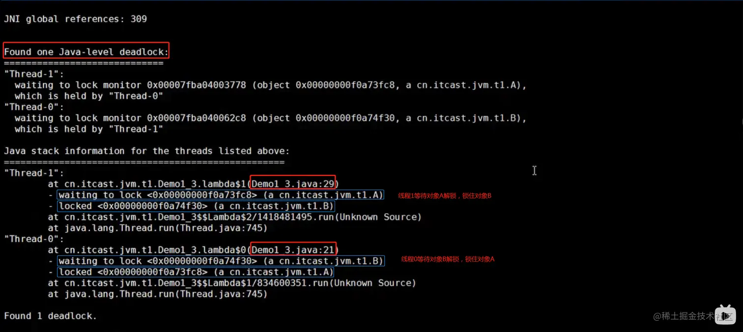线程0锁住了对象A,然后休眠2s——>1s后——>线程1锁住了对象B,然后尝试锁住对象A,但是由于线程0已经锁住对象A,线程1只能等待对象A释放——>到了2s,线程0醒来,尝试获取对象B,但是对象B已经被线程1锁住了,只能等待对象B释放——>线程0和线程1死锁