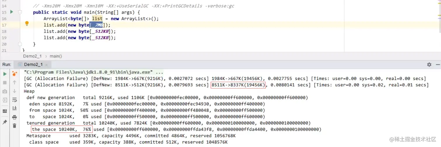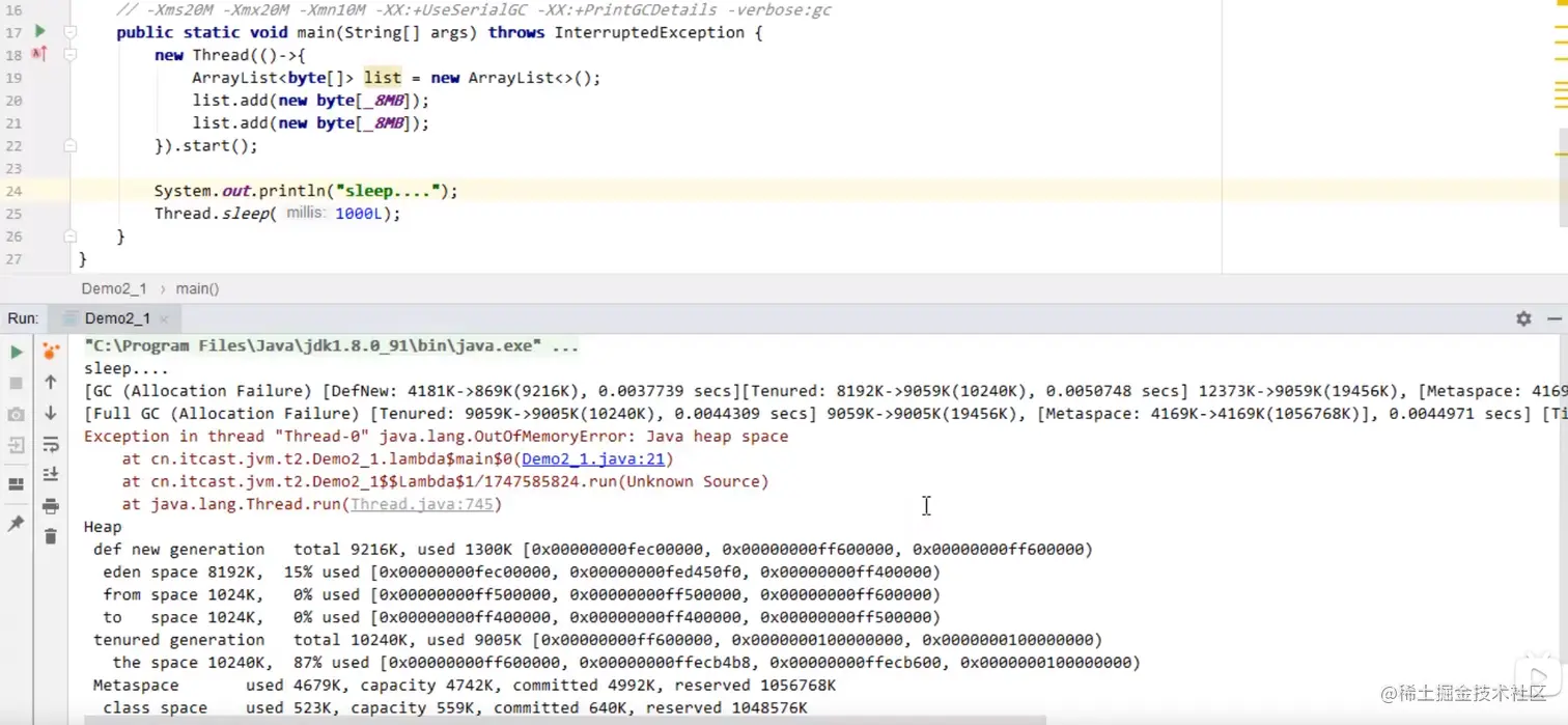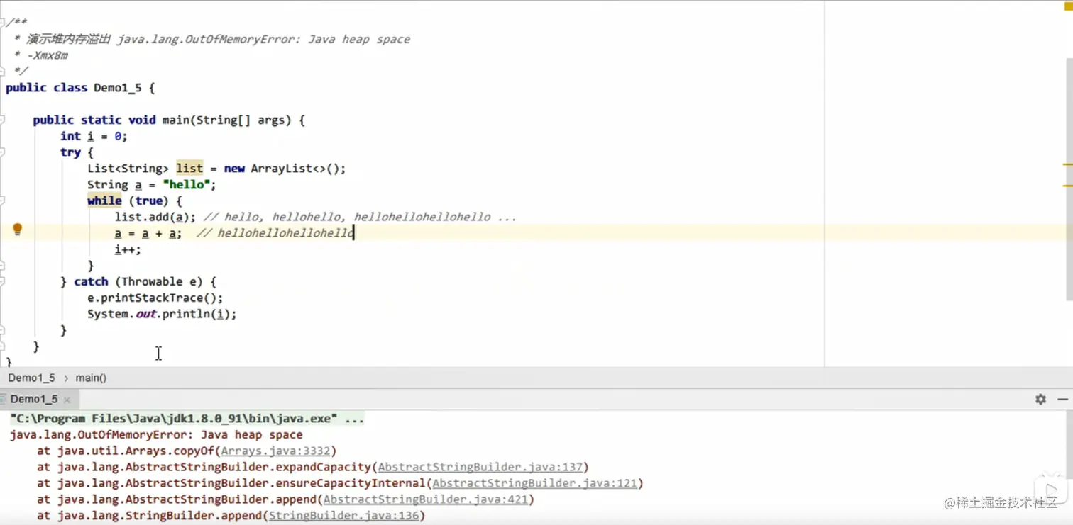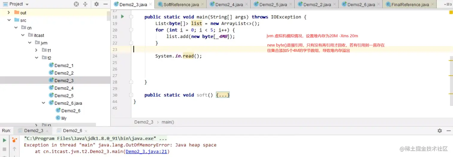 - 当堆内存溢出时,会抛出 OutOfMemoryError:Java heap space异常