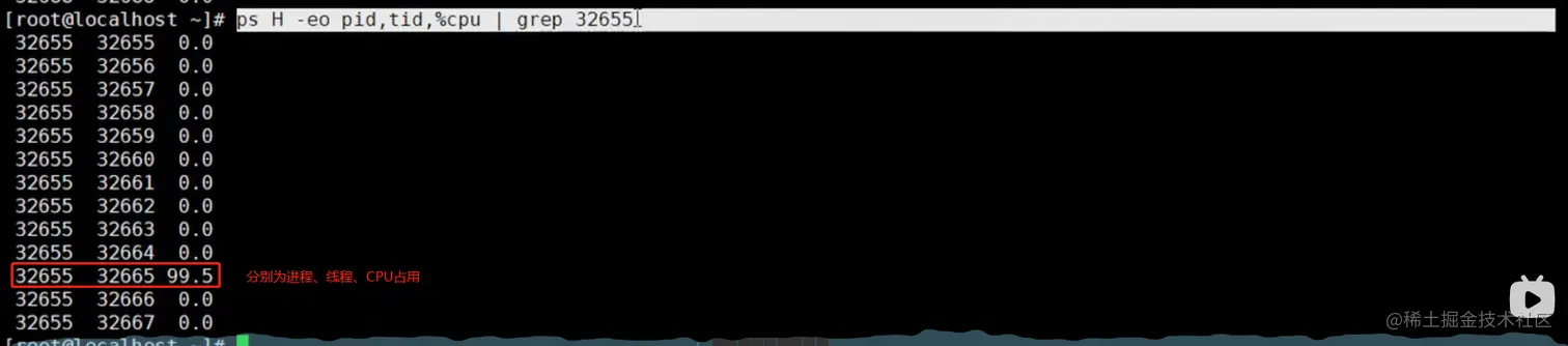 ps H -eo pid,tid,%cpu | grep 32655ps进一步定位哪个线程引起的CPU过高H打印进程数-eo规定输出哪些内容grep过滤 -