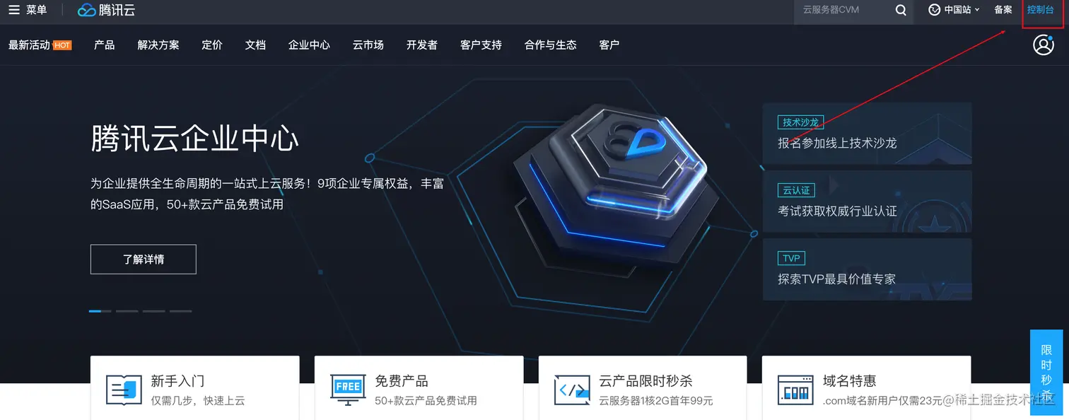 在腾讯云官网登陆,首先登陆自己的腾讯云账号,登陆后点击右上角的控制台