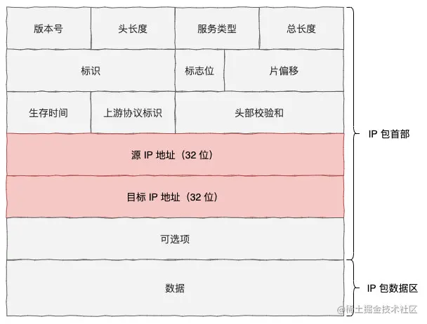IP 包的首部中定义了32 位的源 IP 地址和目的 IP 地址,如下图所示址