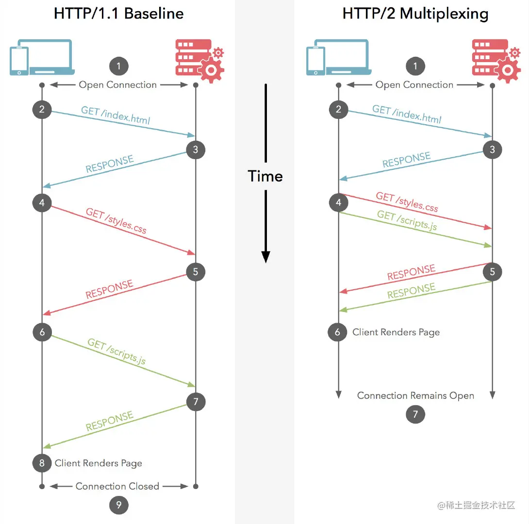 如图示,在 HTTP 2 中,两个请求同时发送,可以同时接收,而在 HTTP 1.1 中必须等上一个请求响应后才能处理下一个请求
