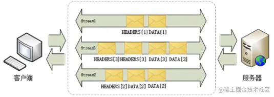 如图示,一个连接里多个流可以同时收发请求-应答数据帧,每个流中数据包按序传输组装