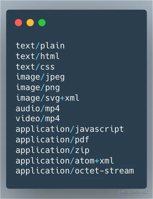 这些数据类型被称为 MIME 类型,指示资源所属类型,请求方如果要上传资源(一般是 POST 请求),可以在用 Content-Type 指定资源所属类型,如果请求方想要获取资源(GET 请求),可以用 Accept 请求头指定想要获取什么资源,这样 server 找到匹配的资源后就可以在 Content-Type 中指定返回的资源类型,浏览器等客户端看到后就可以据此解析处理了